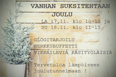 Vanhan Suksitehtaan perinteiset joulunavajaiset tänä vuonna sekä lauantaina 17.11 (klo 10-15) että sunnuntaina 18.11 (klo 11-15). Yläkerrassa maanmainio herkkubuffetti ja alakerrassa tarjolla kuumaa glögiä. Tänä vuonna joulunavajaisissa mukana myös vierailevia käsityöläisiä (varaathan mukaan myös käteistä).